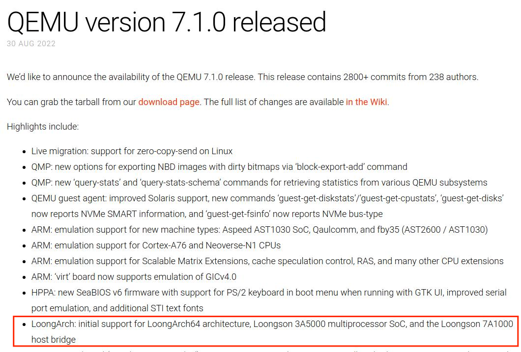 On August 30, 2022, the official QEMU community announced the availability of the QEMU 7.1.0 release, which adds initial support for LoongArch.