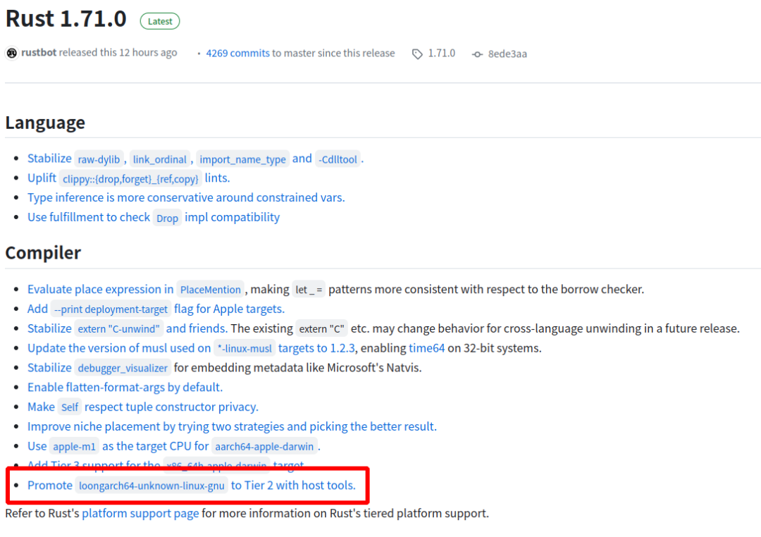 In the previous version, Rust 1.70.0, the Rust community merged the initial support patch set for the loongarch64-unknown-linux-gnu compilation target, providing preliminary Tier-3 support for LoongArch. This time, the Rust 1.71.0 release elevates the support for LoongArch to Tier 2. This progress signifies that the Rust community will natively build and release binary versions for LoongArch, just like other popular ISA communities. The construction of an open-source LoongArch ecosystem has therefore seen another solid step forward.