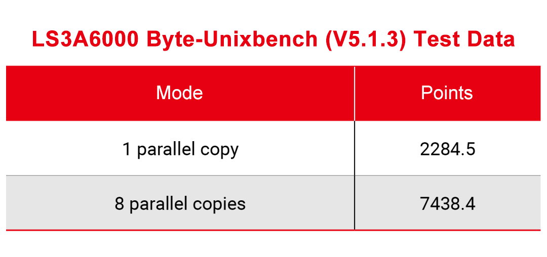 According to the test results from the electromagnetic compatibility laboratory of China Electronics Standardization Institute (CESI-EMC), the quad-core CPU, operating at a frequency of 2.5GHz, demonstrated a single-thread integer/floating point score of 43.1/54.6 in SPEC CPU 2006 base, and a multi-thread integer/floating point score of 155/140 in SPEC CPU 2006 base. The dual DDR4-3200 memory channels exhibited a bandwidth exceeding 42GB/s, with Unixbench measurements surpassing 7,400 points. These test results, evaluated holistically, suggest that the overall performance of the LS3A6000 processor rivals that of Intel's 10th generation quad-core processors launched in 2020.