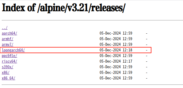 https://dl-cdn.alpinelinux.org/alpine/v3.21/releases/loongarch64/alpine-minirootfs-3.21.0-loongarch64.tar.gz