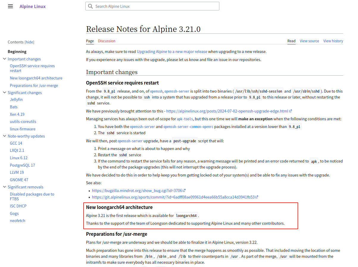 On December 5th, Alpine Linux, an important operating system distribution community in the open source software world and cloud computing field, officially released the latest version 3.21(https://www.alpinelinux.org/posts/Alpine-3.21.0-released.html), achieving native support for the LoongArch in a complete system form, which will effectively promote the ecological construction and application expansion of the LoongArch in the cloud computing field.