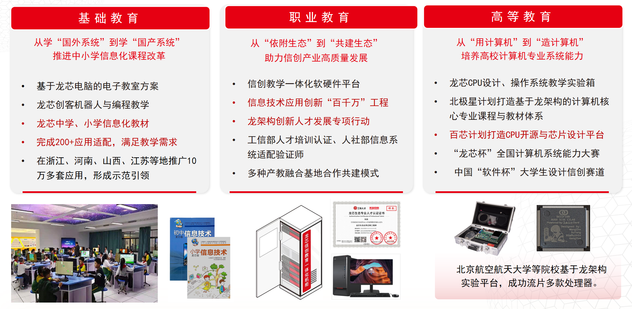 龍芯中科基于龍架構(gòu)自主指令系統(tǒng)、自研處理器芯片和國(guó)產(chǎn)操作系統(tǒng)構(gòu)成的自主技術(shù)體系開展教育生態(tài)建設(shè),通過專業(yè)課程體系與實(shí)踐創(chuàng)新平臺(tái)建設(shè),推動(dòng)高校專業(yè)教育從“用計(jì)算機(jī)”到“造計(jì)算機(jī)”;通過國(guó)產(chǎn)計(jì)算機(jī)基礎(chǔ)知識(shí)普及與信息化課程改革,推動(dòng)信息技術(shù)基礎(chǔ)教育從學(xué)“國(guó)外系統(tǒng)”到學(xué)“國(guó)產(chǎn)系統(tǒng)”。