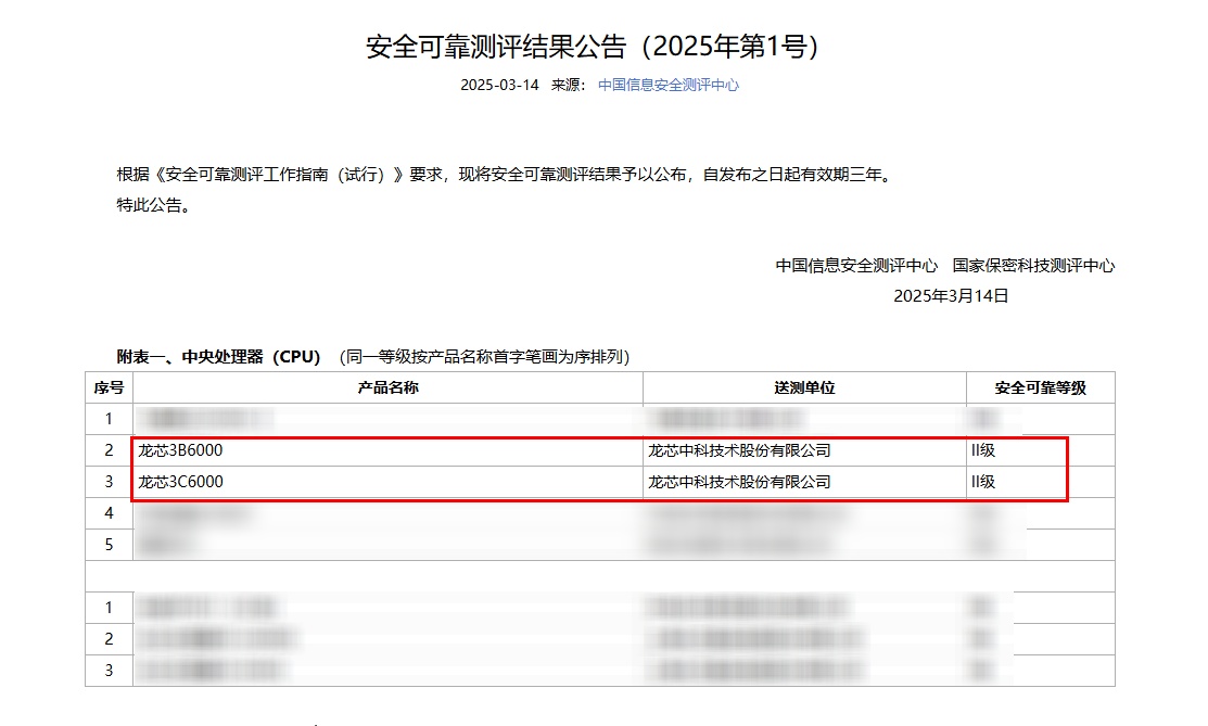 近日,中國信息安全測評中心發(fā)布《安全可靠測評結(jié)果公告(2025年第1號)》,龍芯3B6000、3C6000憑借卓越的技術(shù)實力和優(yōu)異的產(chǎn)品表現(xiàn)成功入圍,并被評定為目前最高等級Ⅱ級。至此,龍芯以40%占比成為安全可靠等級Ⅱ級入選芯片種類最多的企業(yè),更進一步凸顯龍芯產(chǎn)品性能強勁、產(chǎn)品迭代快速、安全可靠的特點。