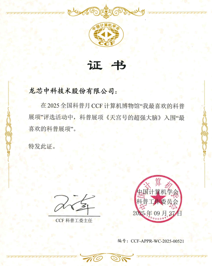 龍芯中科積極踐行企業(yè)社會(huì)責(zé)任,持續(xù)開辦、支持科普活動(dòng)。2025年全國(guó)科普月期間,由龍芯團(tuán)隊(duì)設(shè)計(jì)的《天宮號(hào)的超強(qiáng)大腦》科普展項(xiàng)成功入圍CCF全國(guó)科普月重點(diǎn)活動(dòng)“CCF計(jì)算機(jī)博物館我最喜歡的科普展項(xiàng)”評(píng)選,將航天工程中芯片的特殊設(shè)計(jì)及工作原理轉(zhuǎn)化為可觸可感的科普體驗(yàn)。